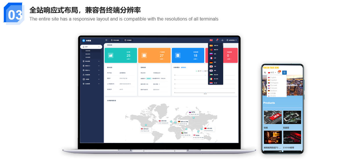 多語站點(diǎn)PC、移動(dòng)雙端同一管理后臺,并支持接入三方CRM系統(tǒng)的線索