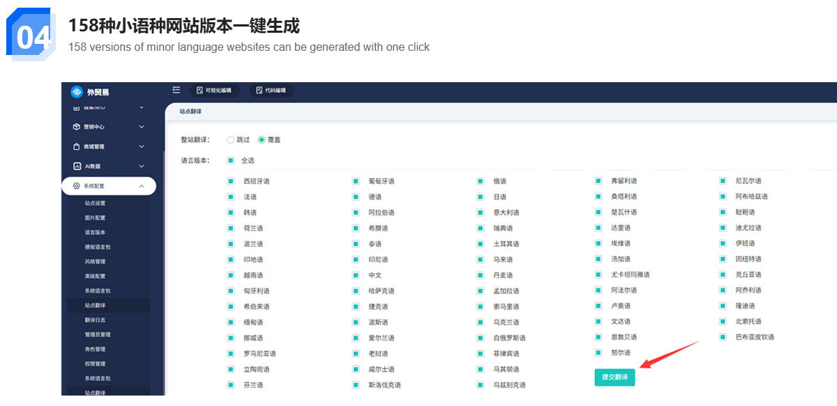 覆蓋200多個(gè)國家和地區(qū),滿足更多小語種訴求按瀏覽器語言跳轉(zhuǎn)網(wǎng)站支持多域名綁定,一鍵翻譯
